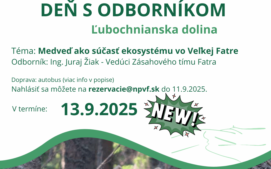 📅 V sobotu 13.9.2025 Vás srdečne pozývame na ďalší Deň s odborníkom. Tentokrát sa spolu s Ing. Jurajom Žiakom, vedúcim Zásahového tímu Fatra pre medveďa hnedého, vydáme do Ľubochnianskej doliny – jednej z najdlhších dolín Slovenska.