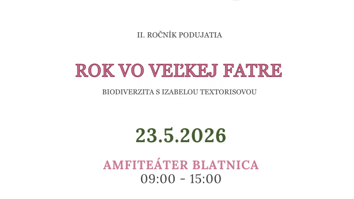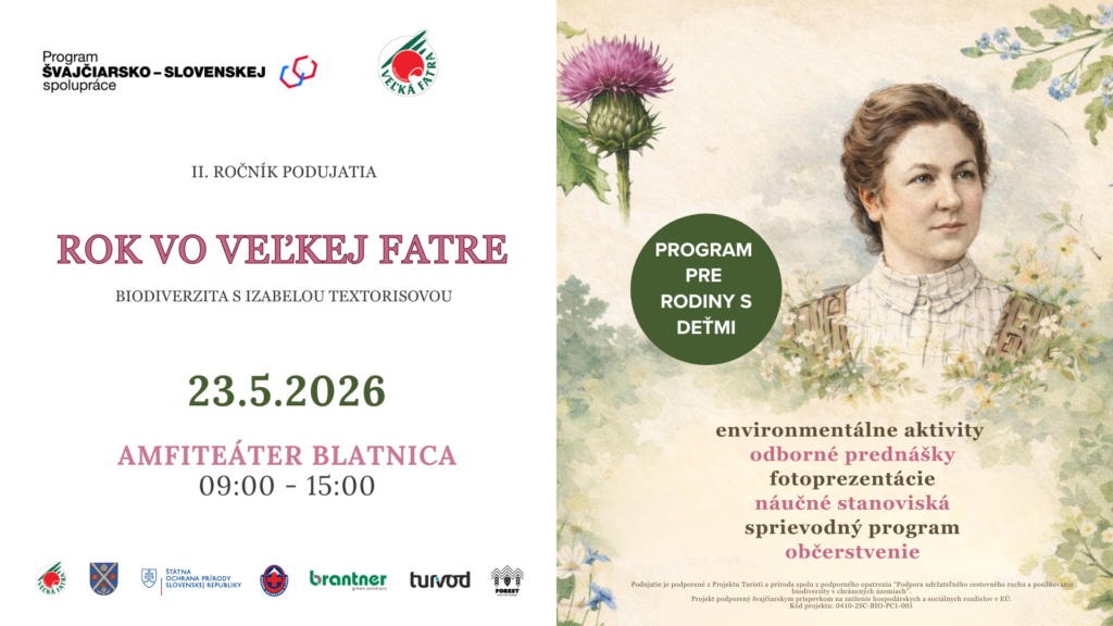 Pozývame vás na druhý ročník podujatia Rok vo Veľkej Fatre, ktorý sa uskutoční v sobotu 23. mája 2026 v areáli amfiteátra v Blatnickej doline. Počas jedného dňa sa toto výnimočné miesto premení na živú učebňu prírody, kde budete môcť objavovať bohatstvo biodiverzity Veľkej Fatry hravou, zážitkovou formou. Podujatie je inšpirované osobnosťou Izabely Textorisovej, prvej slovenskej botaničky, a prepája poznanie s autentickým kontaktom s prírodou.