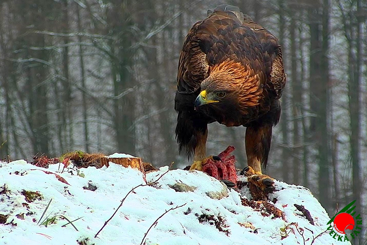 Ako prvý návštevníci sa pred online kamerou ukázali krkavce (Corvus corax). Krkavec čierny je zaradený do radu Passeriformes → spevace. a je považovaný za jedného z najinteligentnejších vtákov našej avifauny. To dokazuje aj jeho sebavedomé dotieravé správanie pri potrave. Neustále sa snaží nájdenú korisť uchovať len pre seba, odnáša si kúsky mäsa a schováva si ich do škár v skalách. Pred pár dňami sme dokonca priamo na online kamere mohli vidieť, ako sa snažil poťahovaním za chvostové perá vyrušiť orla pri žraní, aby ho odradil a viac potravy tak ostalo jemu. Krkavce vytvárajú páry na rozdiel od havranov, s ktorými si ich ľudia často zamieňajú. Hniezdenie v pohorí Veľkej Fatry začína veľmi zavčasu a to už vo februári, kedy je ešte súvislá snehová vrstva.