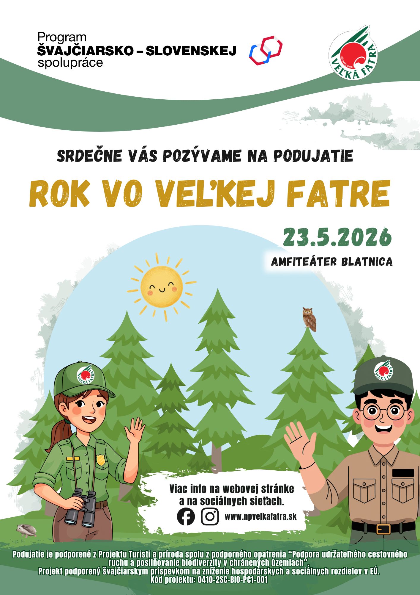 Toto podujatie bude organizované vďaka Realizácii projektu v rámci podporného opatrenia ,,Podpora udržateľného cestovného ruchu a posilňovanie biodiverzity v chránených územiach“ spolufinancovaného z druhého Programu švajčiarsko-slovenskej spolupráce. Kód projektu: 0410-2SC-BIO-PC1-001.